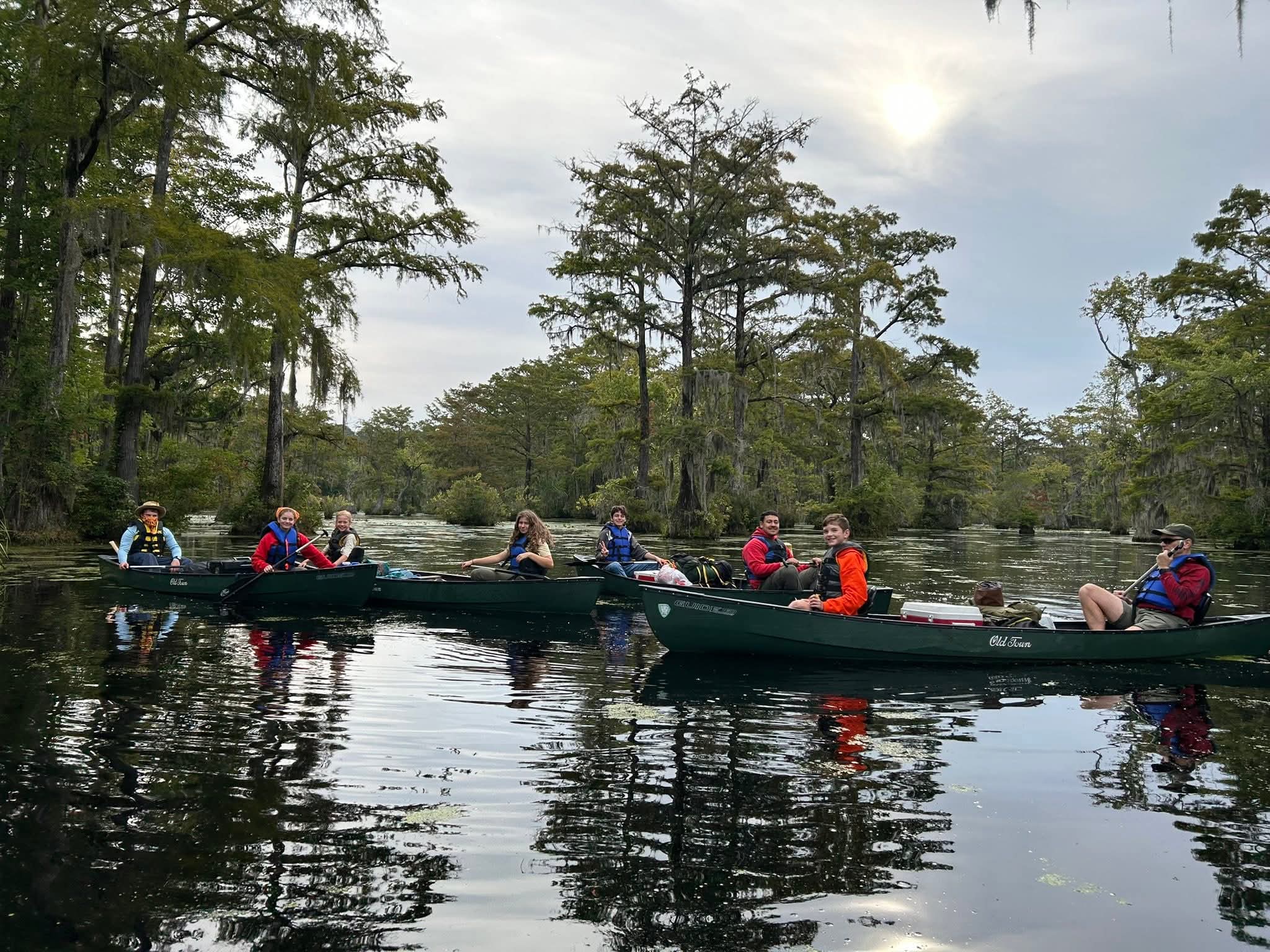 Alligators, maybe! Definitely swamp water and bugs. Perhaps one of the more exciting camping experiences is survival campout. Troops 242 B and 242 G combined a campout at Merchants Millpond in North Carolina. In order to get to the campsite, you have to “canoe-in. On average, it takes roughly 45 minutes depending on the weather and whether or not the gators are awake or sleeping, so I’ve heard!☺️. All 8 scouts earned their Wilderness Survival Merit Badge.