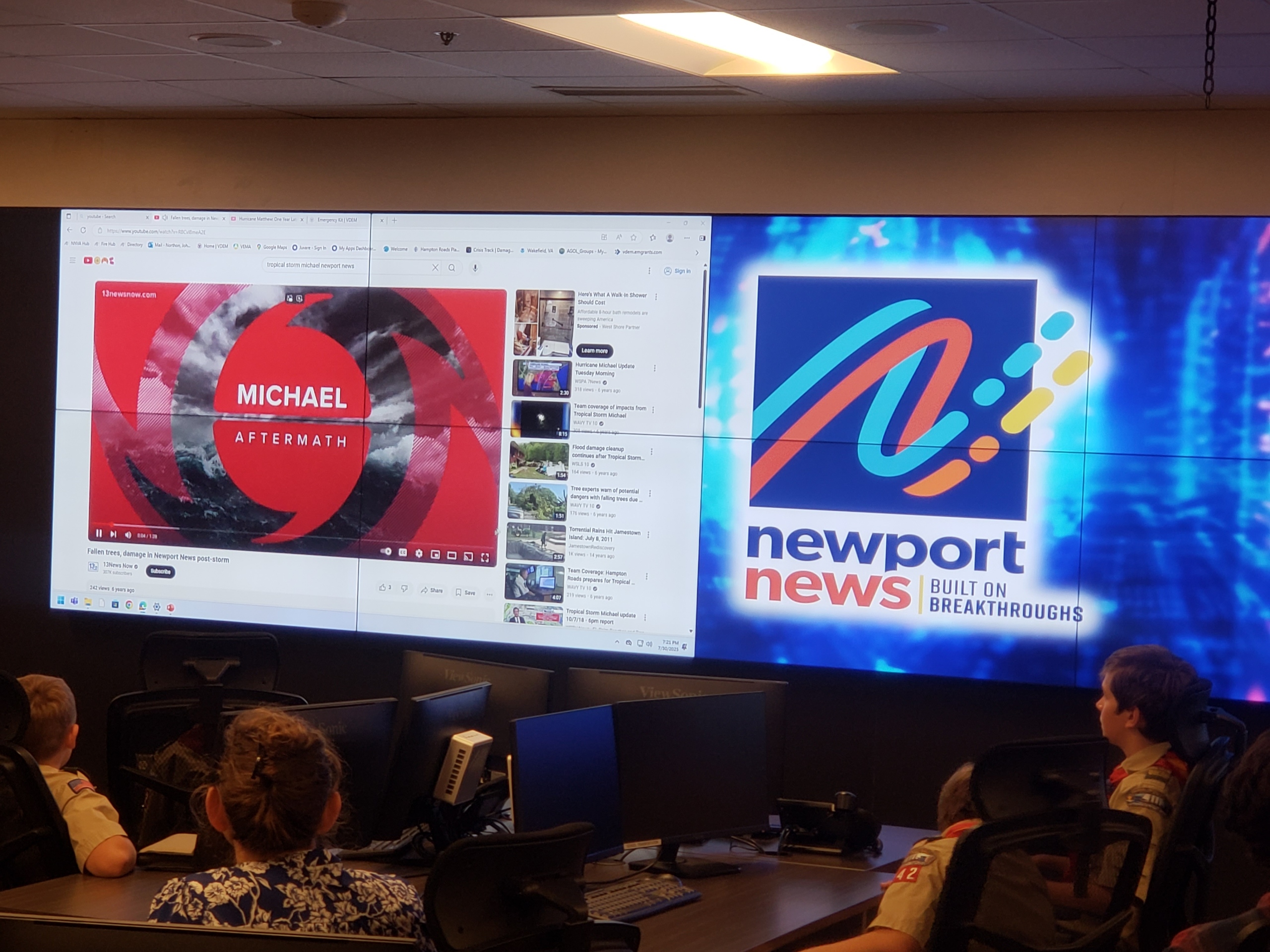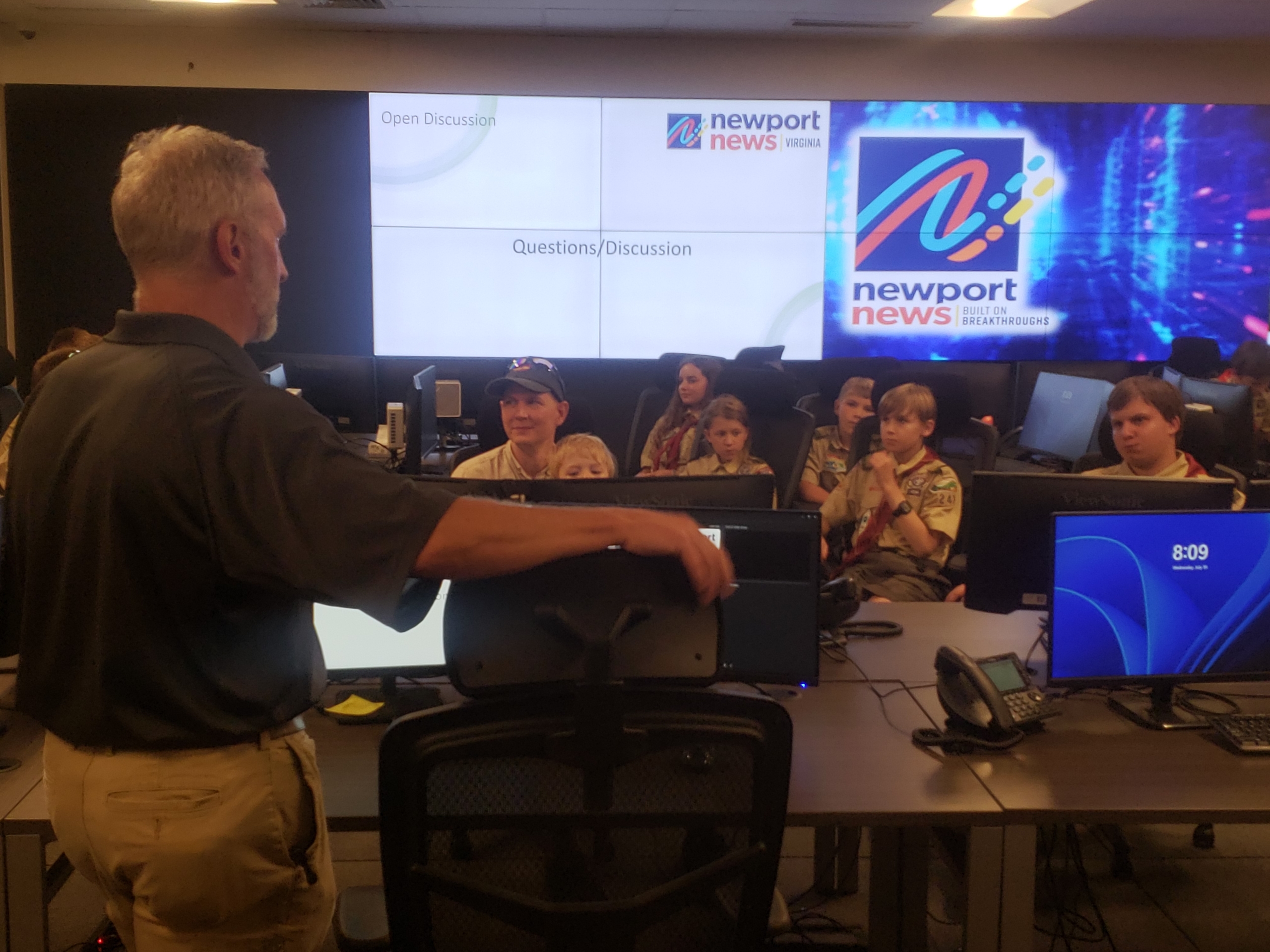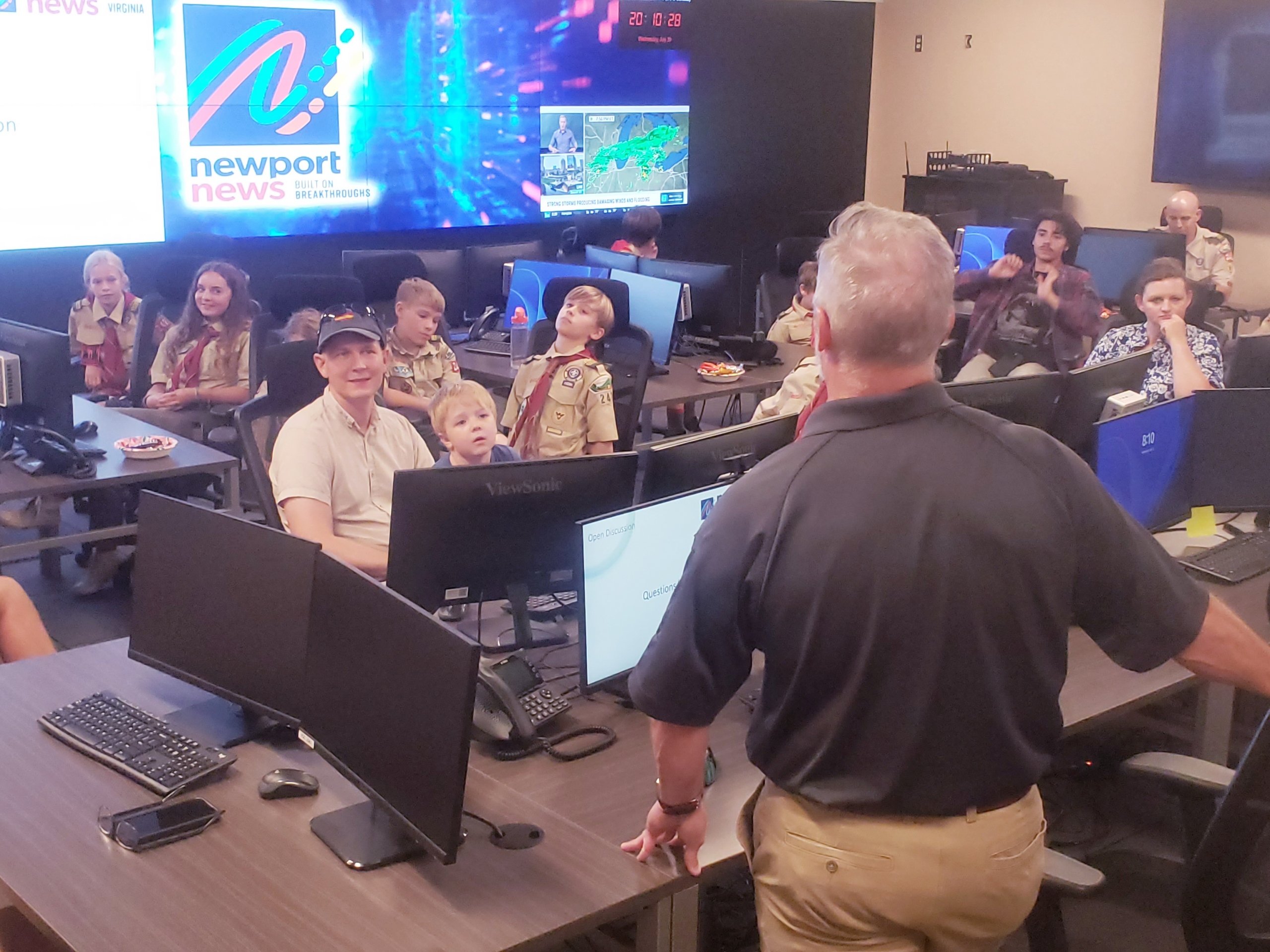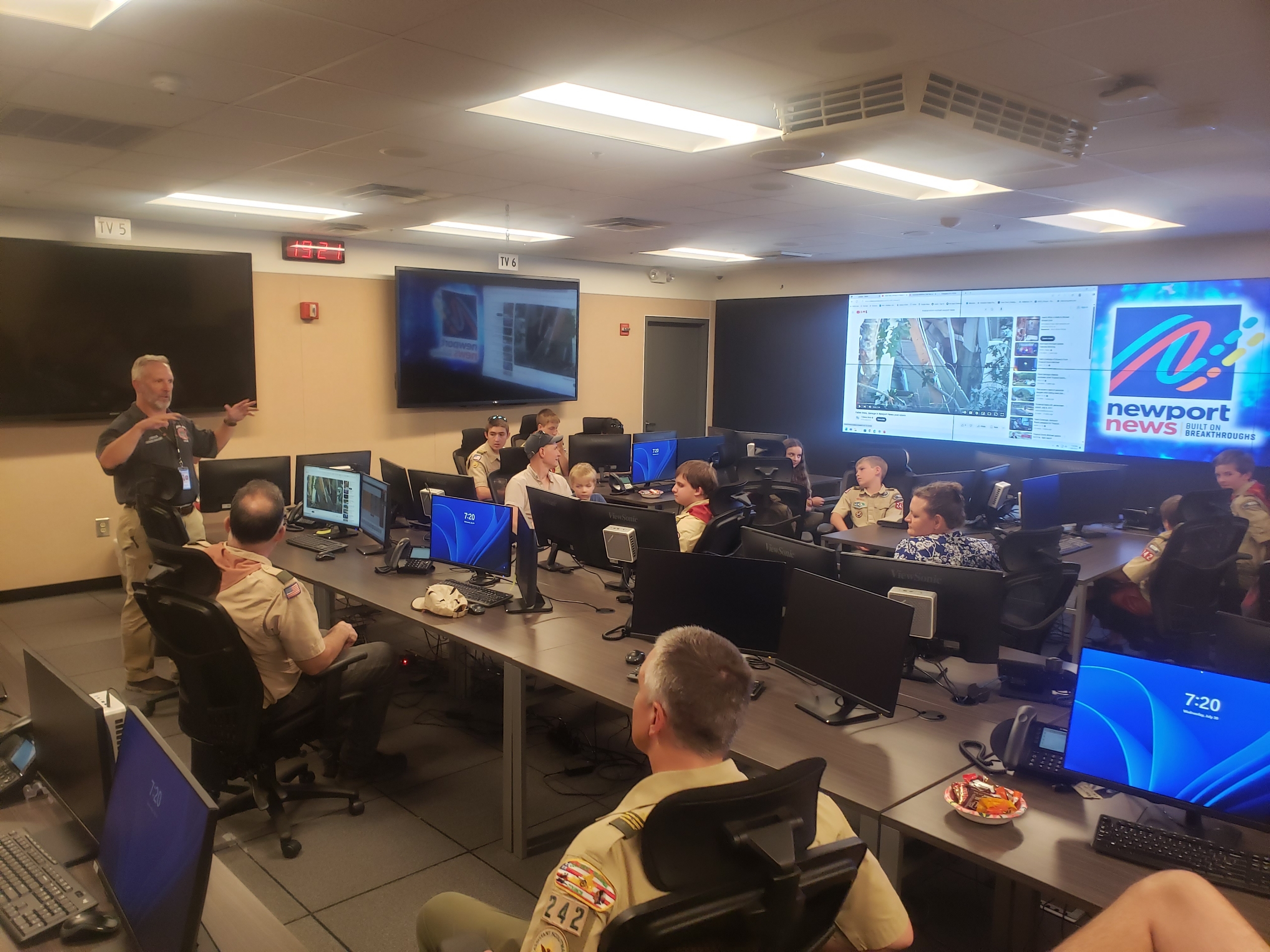 Scouts from Troop 242 took an evening field trip to The city of Newport News’ Emergency Management Operations Center, set up by SPL Josh. The ops building is the central hub for natural disasters. Several monitors line the walls, and computers are in abundance. John Northam, the Fire Department’s Emergency Operations Manager, explained to the scouts how information is processed.