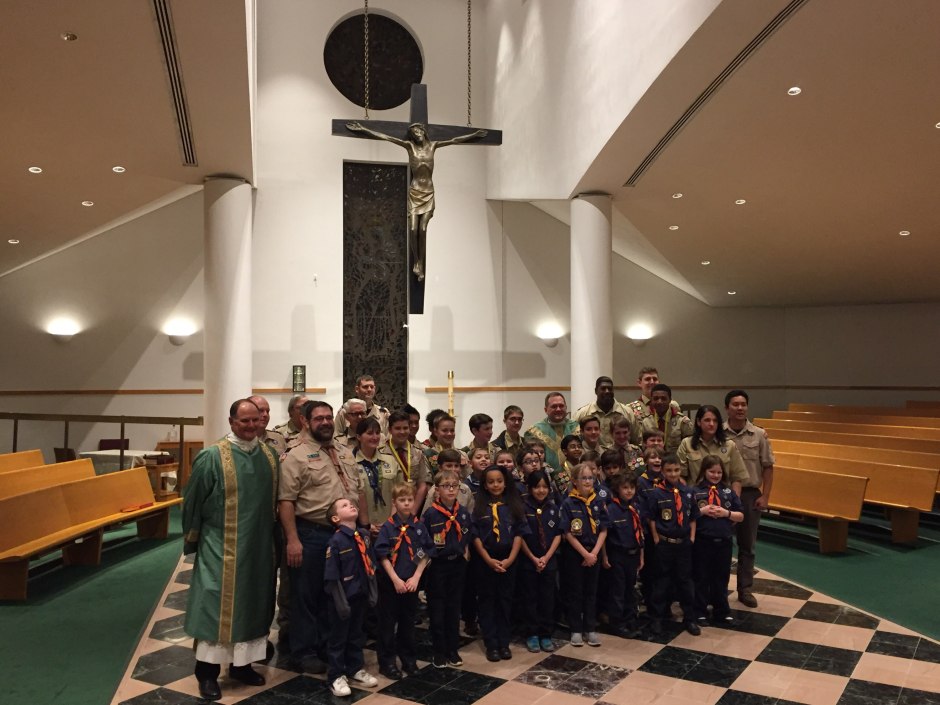 An ideal of scouting is duty to God. One of our beliefs is that a scout is reverent. Members of Troop 242 and several cub scout packs joined together to celebrate God during Scout Sunday Mass.