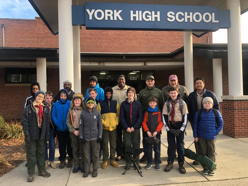 There were 13 Scouts and 5 adults that braved the cold in support of the Knights of Columbus’ Run For The Heart. We were the water station at mile 6 of 10. One runner said, “This is the best water station I have come past!” We take our service seriously while having fun.