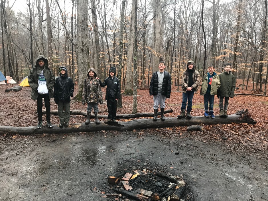 Rain? We didn’t notice the rain because we were too busy being Scouts! We celebrated two bridging ceremonies, Pack 242 and Pack 342, plus a birthday. Pack 48 joined in the fun too. We retired flags in a fire. We had many chefs in the kitchen making tasty food in cast iron. The new scouts followed the model of older scouts in the bone yard while they worked on their Totin’ Chit. Newport News Park had perfect terrain for orienteering too.