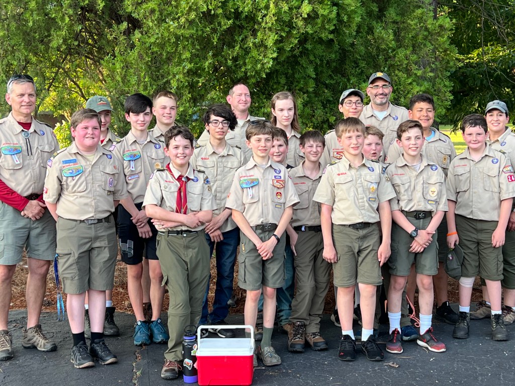 In April, we had our hiking camp out at Camp Baker. We completed a 5 mile hike, which helped newly bridged scouts finish a Tenderfoot requirement. After completing the hike, many scouts took the opportunity to relax on the docks near the lake while Eagle Patrol prepared ramen. A campfire program was held in the evening with skits and songs performed by each patrol. We shared lots of laughs and jokes together.