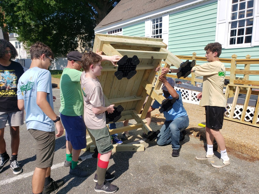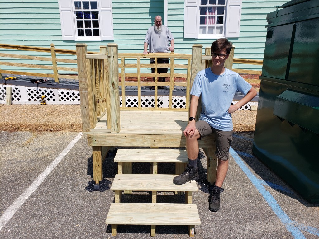 On the road to have yet another Eagle Scout in Troop 242 is Abel, whom had his Eagle Scout project was at Five loaves food pantry. The project was to construct a platform for people to reach the top of a dumpster to dump trash. In total with the assistance of Abel’s 9 fellow scouts the project was completed in 2 hours and 30 minutes In total 38 and a half hours were logged in the making of this project. Bellow are some photos of the platform being built and the final product.