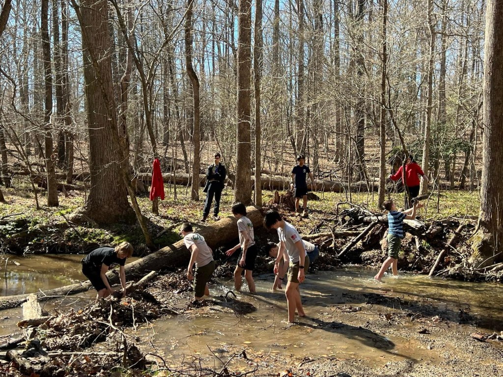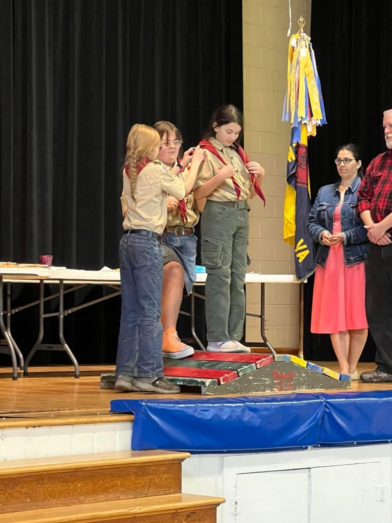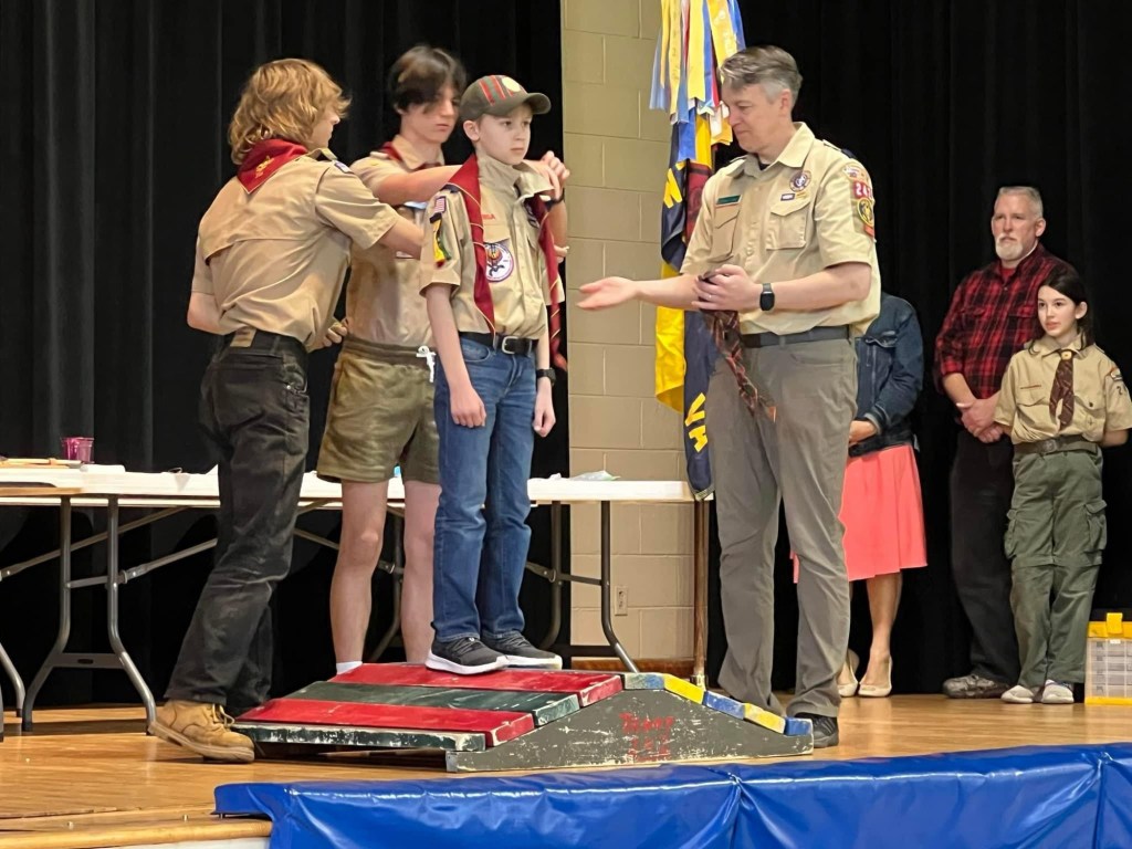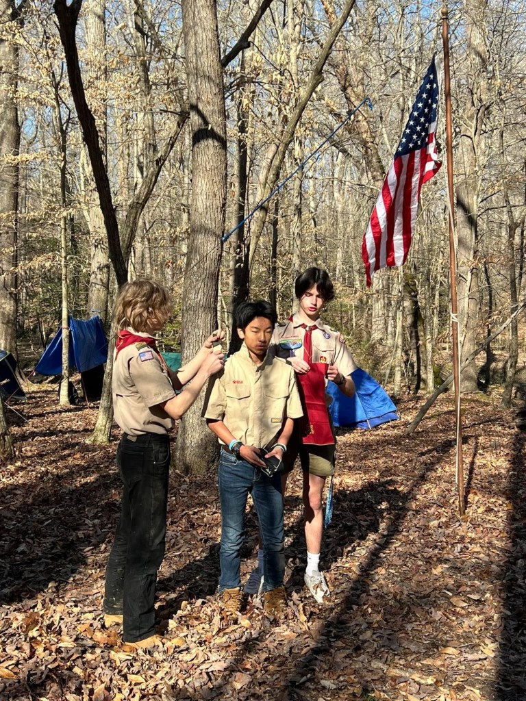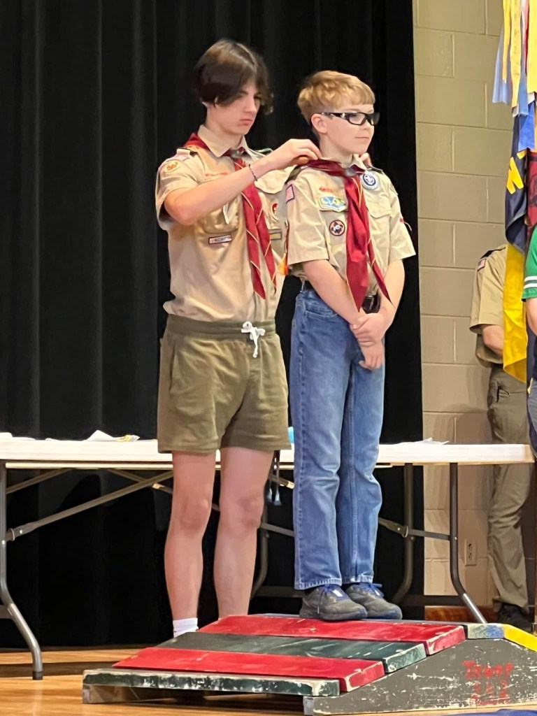During our crossover campout we welcomed three new scouts to Troop 242! Dexter, Lucas, Carmela crossed over from Pack 242 to Troop 242 during their Blue and Gold banquet. We took them back to our campsite and they got started right away on rank requirements. They also earned their Totin’ Chip and Firem’n Chit. Scouts also worked on a Conservation Project and Jack was presented with his official neckerchief and epaulettes.