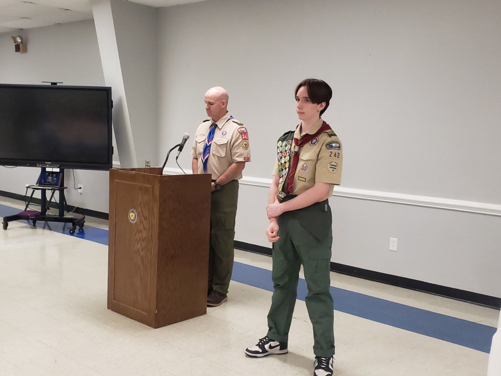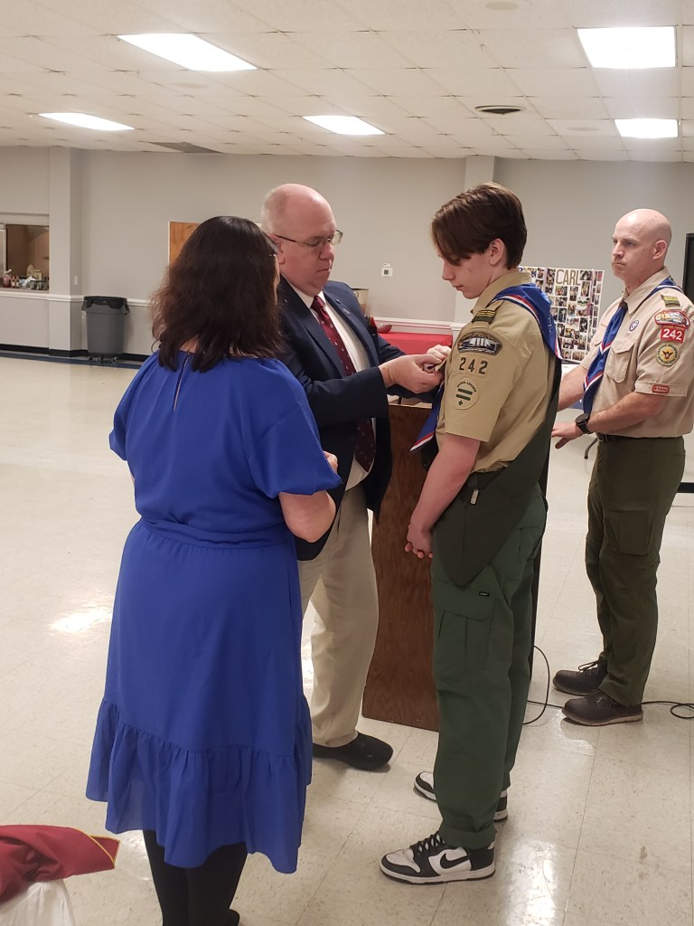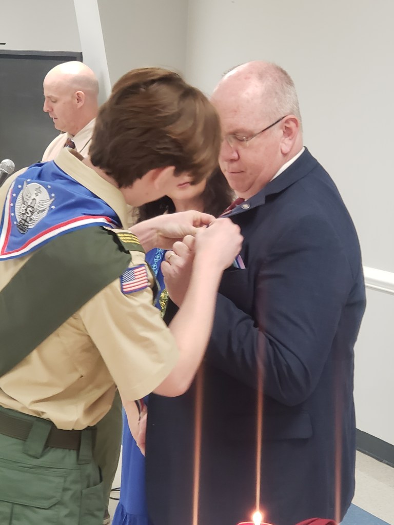 The highlight of scouting is obtaining the rank of Eagle Scout. Some scouts gathered recently at the Scottish Rite Temple to honor Carl for his Eagle Court of Honor. It was a nice celebration for him and his family and for other scouts to talk about memories they shared on campouts. Congratulations to Carl for a job well done!